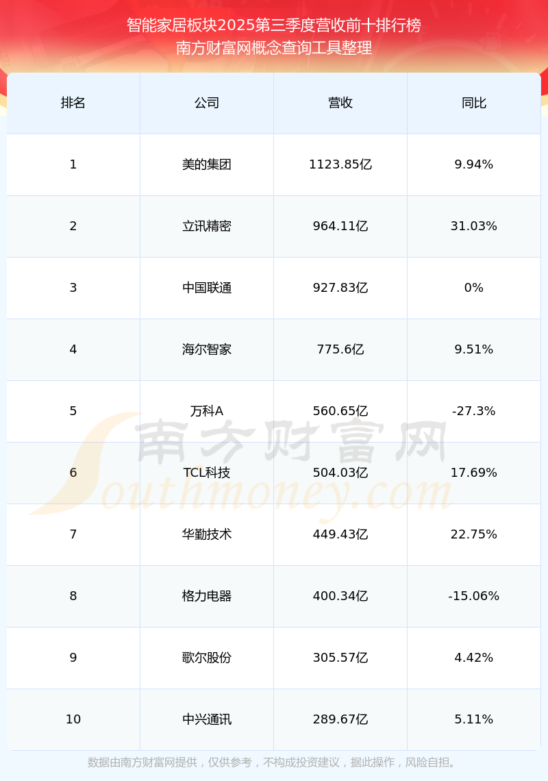 按照南方財富網(wǎng)概念查詢工具統(tǒng)計,該股所屬板塊為智能家居板塊,該板塊共有298只股票,喜臨門2025第三季度營收在該板塊中排名為第75名,該板塊2025第三季度營收排名前十的股票如下表: