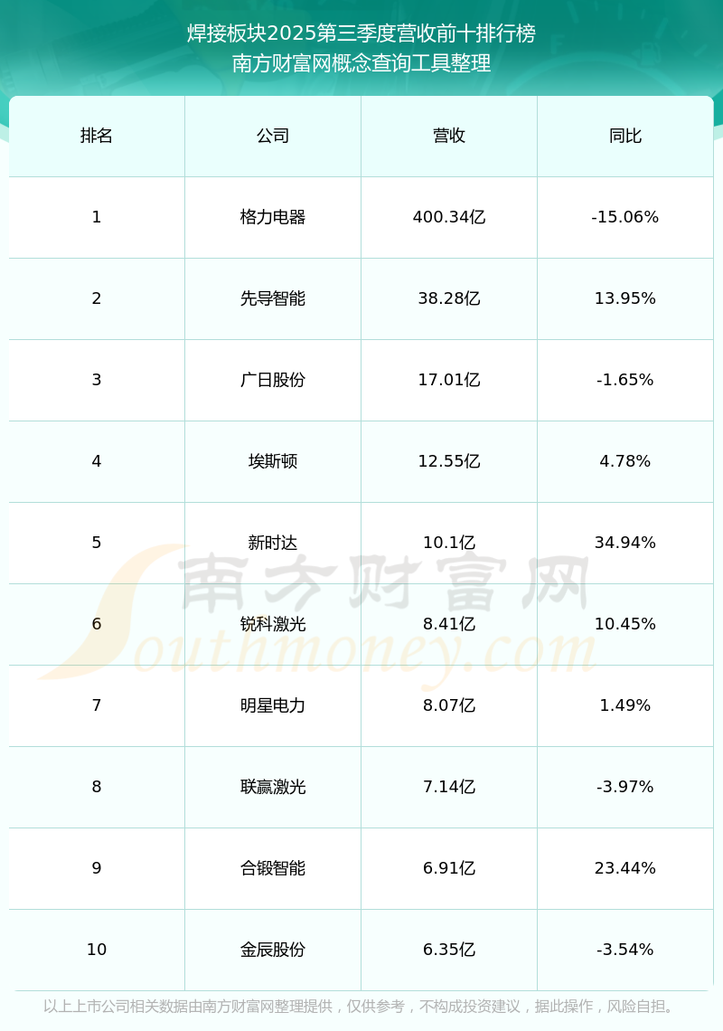 按照南方財(cái)富網(wǎng)概念查詢工具統(tǒng)計(jì),該股所屬板塊為焊接板塊,該板塊共有23只股票,聯(lián)贏激光2025第三季度營(yíng)收在該板塊中排名為第8名,該板塊2025第三季度營(yíng)收排名前十的股票如下表: