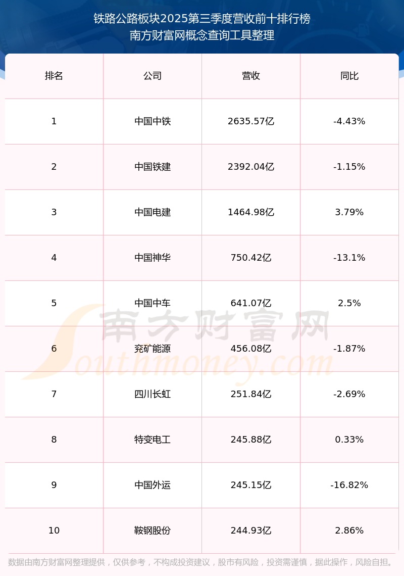 按照南方財富網(wǎng)概念查詢工具統(tǒng)計,該股所屬板塊為鐵路公路板塊,該板塊共有120只股票,重慶路橋2025第三季度營收在該板塊中排名為第120名,該板塊2025第三季度營收排名前十的股票如下表: