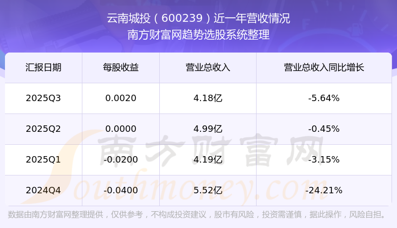 云南城投2025年第三季度財(cái)報(bào)顯示,公司主營(yíng)收入4.18億元,同比-5.64%;歸母凈利潤(rùn)249.87萬(wàn)元,同比110.81%;扣非凈利潤(rùn)-7677.26萬(wàn)元,同比-386.57%;