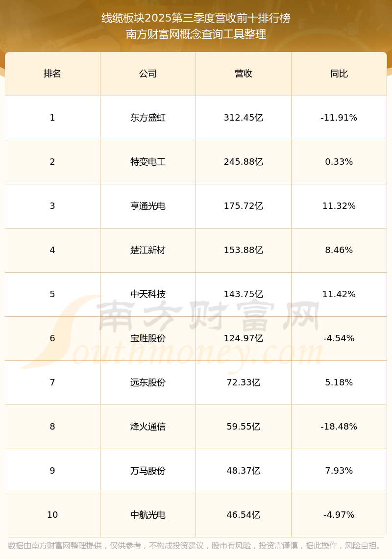 按照南方財富網(wǎng)概念查詢工具統(tǒng)計,該股所屬板塊為線纜板塊,該板塊共有33只股票,烽火通信2025第三季度營收在該板塊中排名為第8名,該板塊2025第三季度營收排名前十的股票如下表: