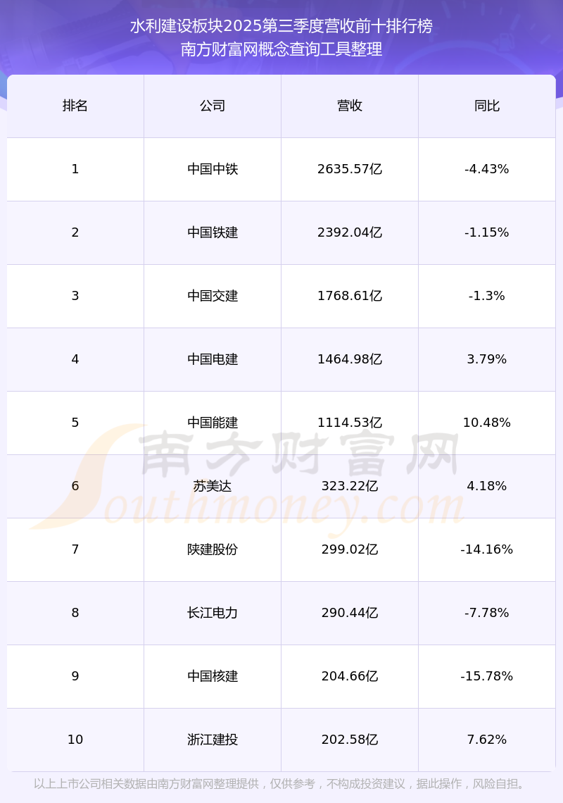 按照南方財富網概念查詢工具統計,該股所屬板塊為水利建設板塊,該板塊共有137只股票,大元泵業(yè)2025第三季度營收在該板塊中排名為第82名,該板塊2025第三季度營收排名前十的股票如下表: