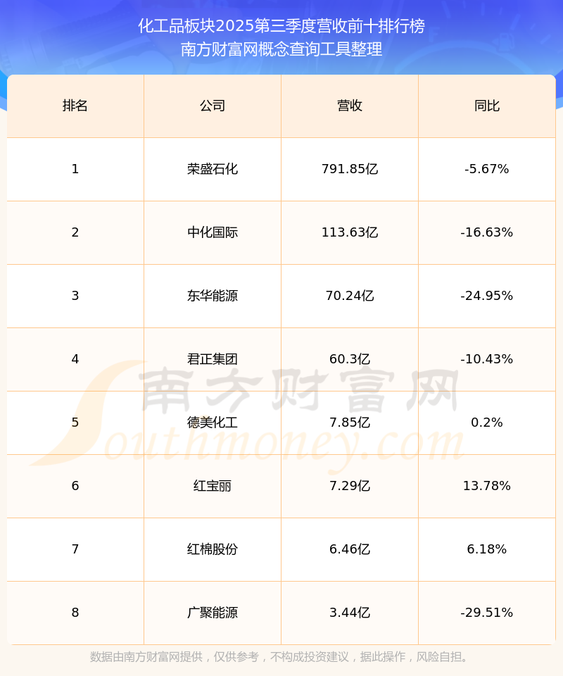 按照南方財富網(wǎng)概念查詢工具統(tǒng)計,該股所屬板塊為化工品板塊,該板塊共有8只股票,渤;瘜W(xué)2025第三季度營收在該板塊中排名為第8名,該板塊2025第三季度營收排名前十的股票如下表: