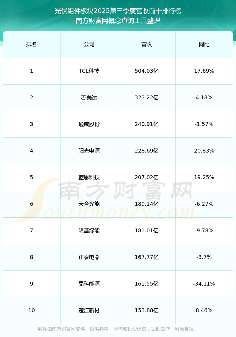 按照南方財(cái)富網(wǎng)概念查詢工具統(tǒng)計(jì),該股所屬板塊為光伏組件板塊,該板塊共有109只股票,阿特斯2025第三季度營收在該板塊中排名為第13名,該板塊2025第三季度營收排名前十的股票如下表: