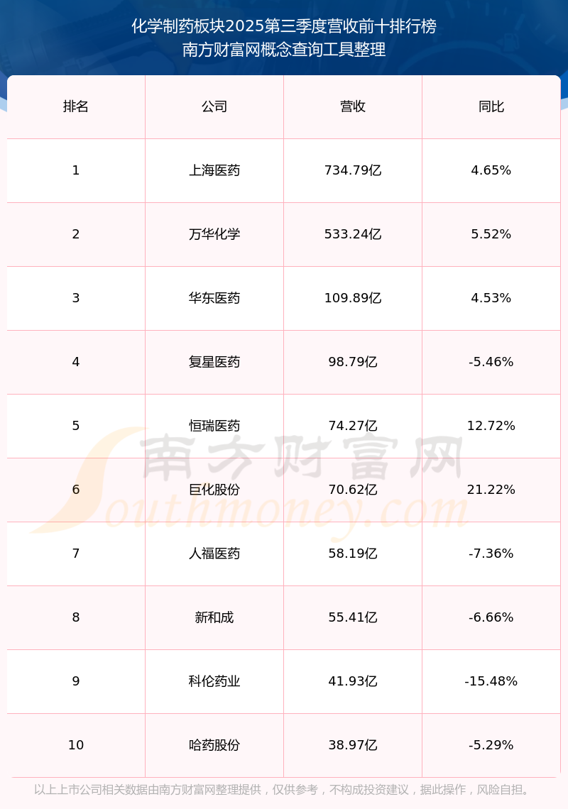 按照南方財富網(wǎng)概念查詢工具統(tǒng)計,該股所屬板塊為化學(xué)制藥板塊,該板塊共有175只股票,聯(lián)環(huán)藥業(yè)2025第三季度營收在該板塊中排名為第54名,該板塊2025第三季度營收排名前十的股票如下表: