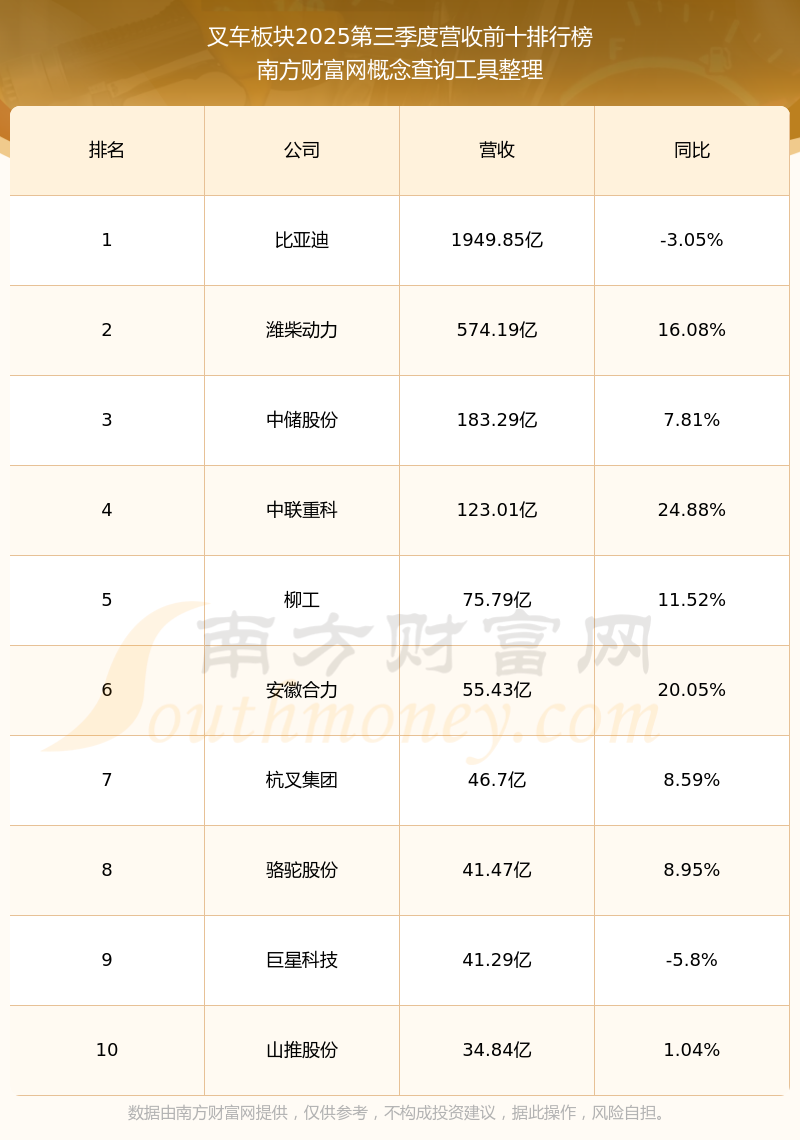 按照南方財富網(wǎng)概念查詢工具統(tǒng)計,該股所屬板塊為叉車板塊,該板塊共有23只股票,安徽合力2025第三季度營收在該板塊中排名為第6名,該板塊2025第三季度營收排名前十的股票如下表: