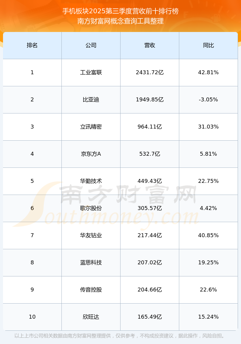 按照南方財富網(wǎng)概念查詢工具統(tǒng)計,該股所屬板塊為手機板塊,該板塊共有137只股票,波導股份2025第三季度營收在該板塊中排名為第137名,該板塊2025第三季度營收排名前十的股票如下表: