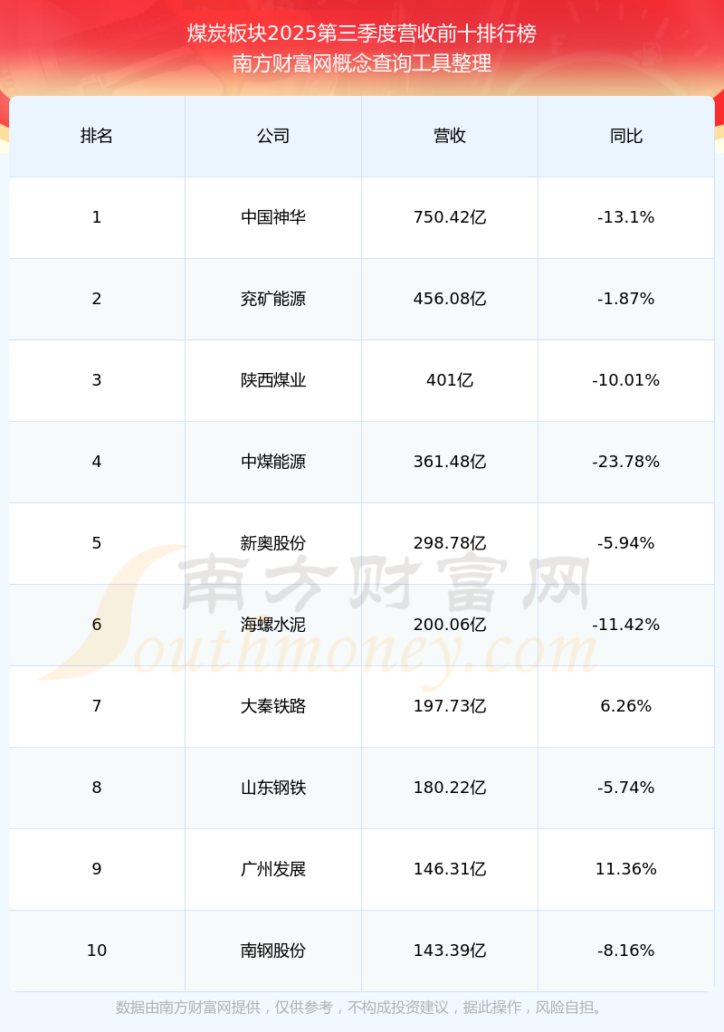 按照南方財(cái)富網(wǎng)概念查詢工具統(tǒng)計(jì),該股所屬板塊為煤炭板塊,該板塊共有72只股票,陜西煤業(yè)2025第三季度營收在該板塊中排名為第3名,該板塊2025第三季度營收排名前十的股票如下表: