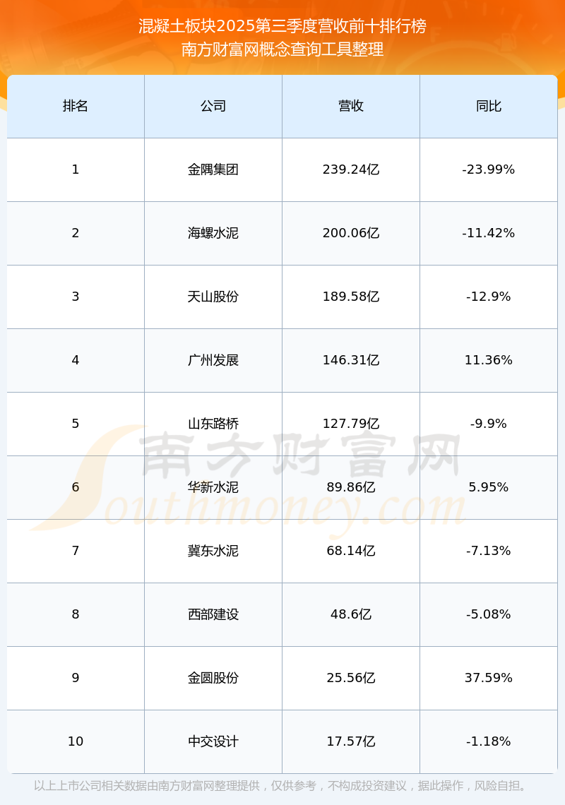 按照南方財富網(wǎng)概念查詢工具統(tǒng)計,該股所屬板塊為混凝土板塊,該板塊共有25只股票,金隅集團2025第三季度營收在該板塊中排名為第1名,該板塊2025第三季度營收排名前十的股票如下表: