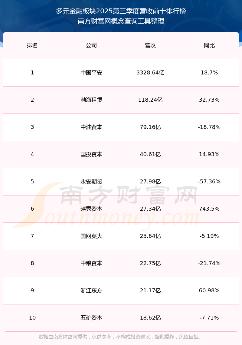 按照南方財富網概念查詢工具統(tǒng)計,該股所屬板塊為多元金融板塊,該板塊共有35只股票,香溢融通2025第三季度營收在該板塊中排名為第27名,該板塊2025第三季度營收排名前十的股票如下表: