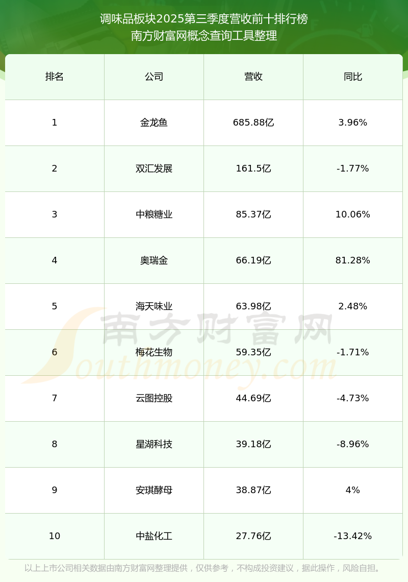 按照南方財(cái)富網(wǎng)概念查詢工具統(tǒng)計(jì),該股所屬板塊為調(diào)味品板塊,該板塊共有49只股票,海天味業(yè)2025第三季度營(yíng)收在該板塊中排名為第5名,該板塊2025第三季度營(yíng)收排名前十的股票如下表: