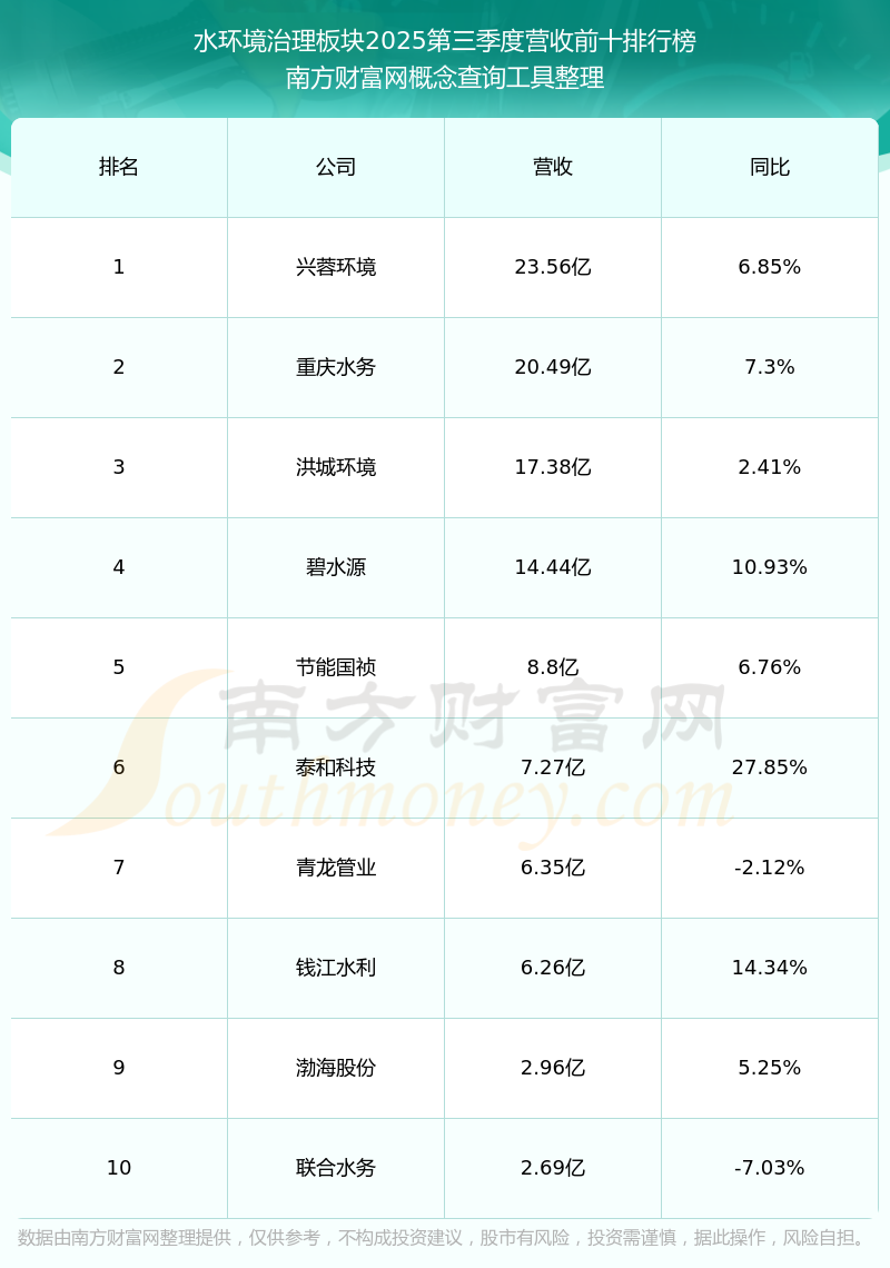 按照南方財(cái)富網(wǎng)概念查詢工具統(tǒng)計(jì),該股所屬板塊為水環(huán)境治理板塊,該板塊共有26只股票,正和生態(tài)2025第三季度營收在該板塊中排名為第25名,該板塊2025第三季度營收排名前十的股票如下表:
