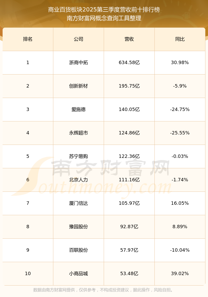 按照南方財(cái)富網(wǎng)概念查詢(xún)工具統(tǒng)計(jì),該股所屬板塊為商業(yè)百貨板塊,該板塊共有74只股票,南寧百貨2025第三季度營(yíng)收在該板塊中排名為第67名,該板塊2025第三季度營(yíng)收排名前十的股票如下表: