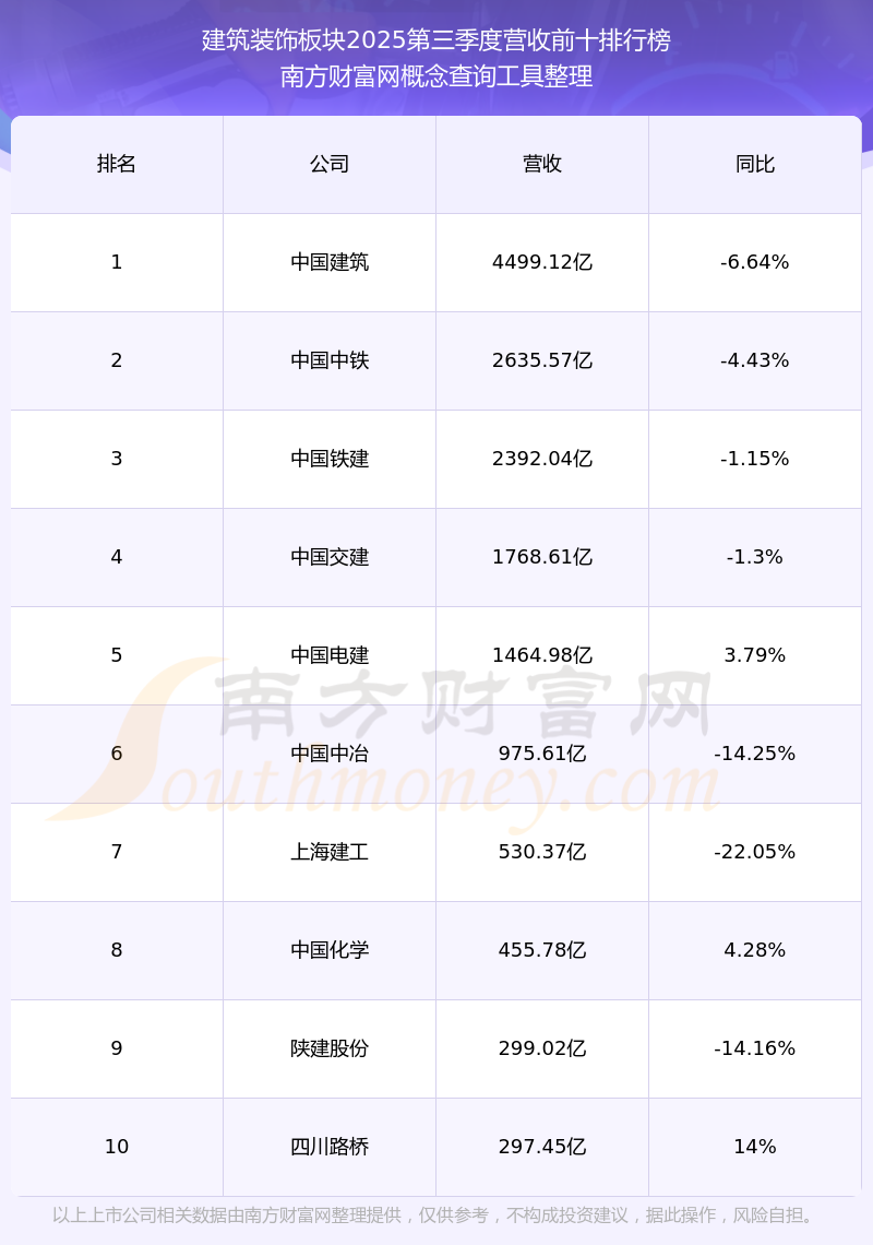 按照南方財富網(wǎng)概念查詢工具統(tǒng)計,該股所屬板塊為建筑裝飾板塊,該板塊共有133只股票,科新發(fā)展2025第三季度營收在該板塊中排名為第107名,該板塊2025第三季度營收排名前十的股票如下表:
