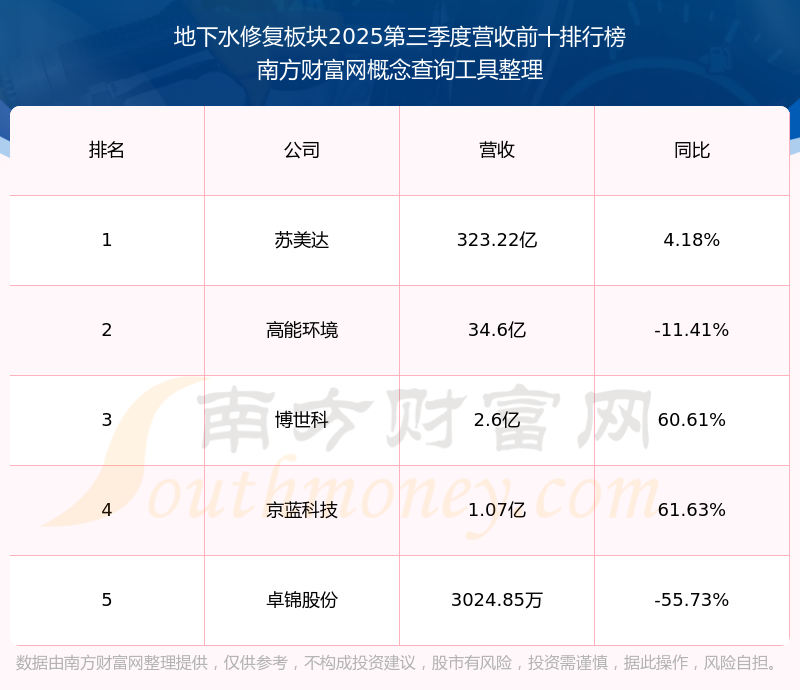 按照南方財富網(wǎng)概念查詢工具統(tǒng)計(jì),該股所屬板塊為地下水修復(fù)板塊,該板塊共有5只股票,卓錦股份2025第三季度營收在該板塊中排名為第5名,該板塊2025第三季度營收排名前十的股票如下表: