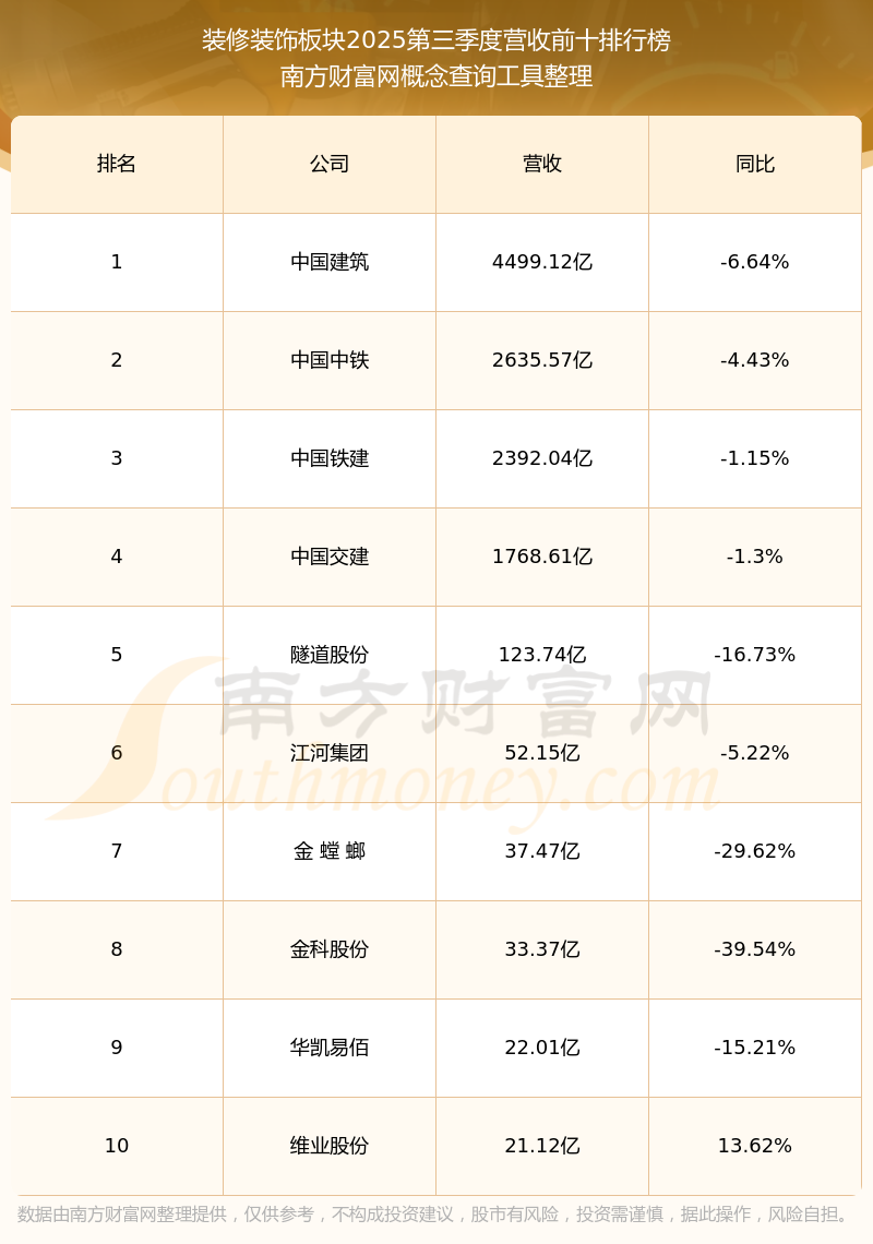 按照南方財富網(wǎng)概念查詢工具統(tǒng)計,該股所屬板塊為裝修裝飾板塊,該板塊共有57只股票,聯(lián)翔股份2025第三季度營收在該板塊中排名為第56名,該板塊2025第三季度營收排名前十的股票如下表: