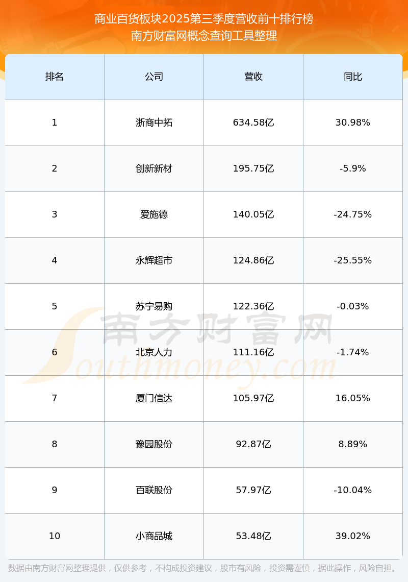 按照南方財富網概念查詢工具統(tǒng)計,該股所屬板塊為商業(yè)百貨板塊,該板塊共有74只股票,寧波中百2025第三季度營收在該板塊中排名為第68名,該板塊2025第三季度營收排名前十的股票如下表: