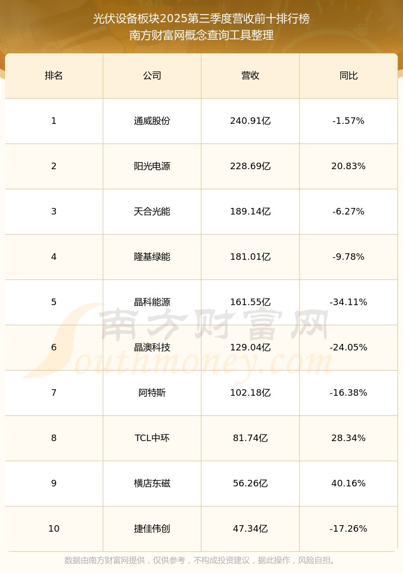 按照南方財(cái)富網(wǎng)概念查詢工具統(tǒng)計(jì),該股所屬板塊為光伏設(shè)備板塊,該板塊共有71只股票,億晶光電2025第三季度營(yíng)收在該板塊中排名為第52名,該板塊2025第三季度營(yíng)收排名前十的股票如下表: