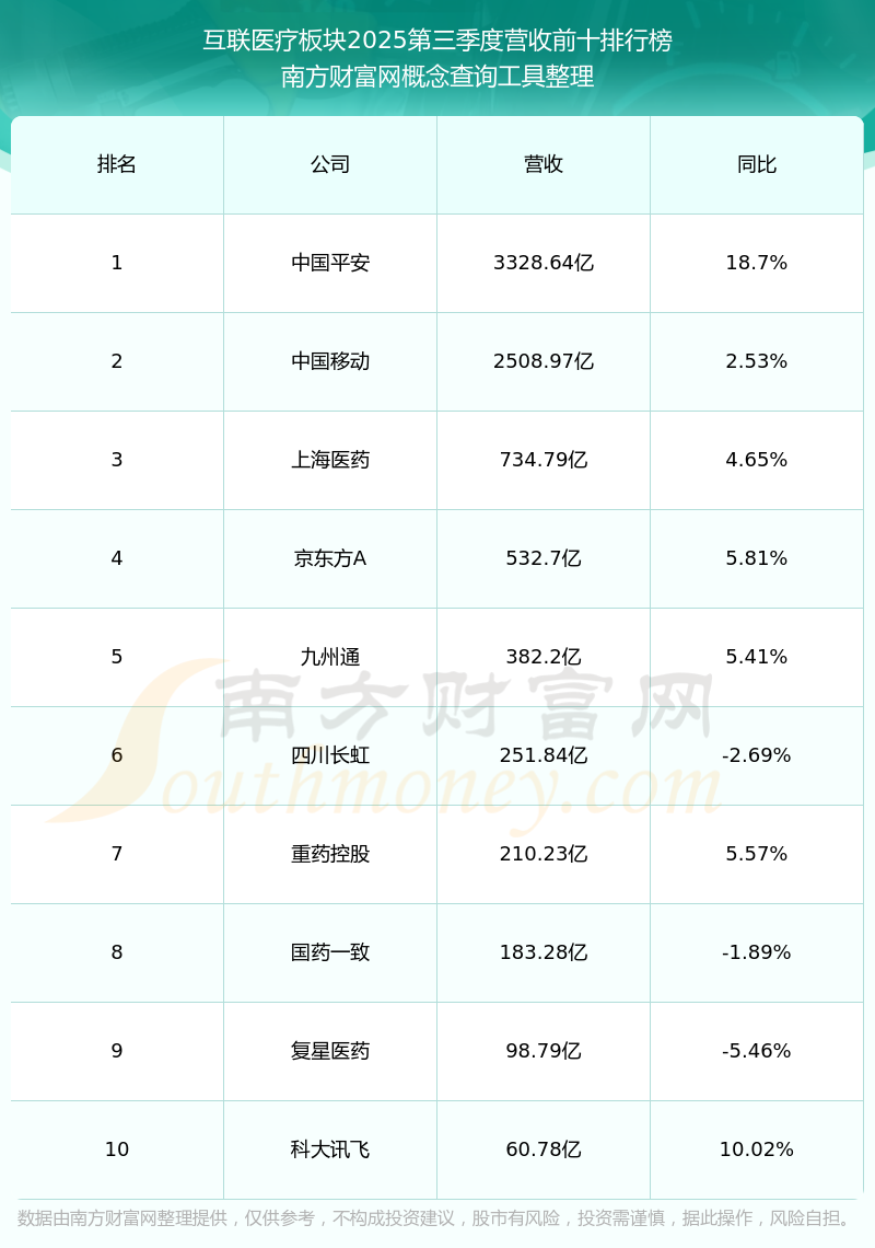 按照南方財富網(wǎng)概念查詢工具統(tǒng)計,該股所屬板塊為互聯(lián)醫(yī)療板塊,該板塊共有127只股票,上海醫(yī)藥2025第三季度營收在該板塊中排名為第3名,該板塊2025第三季度營收排名前十的股票如下表:
