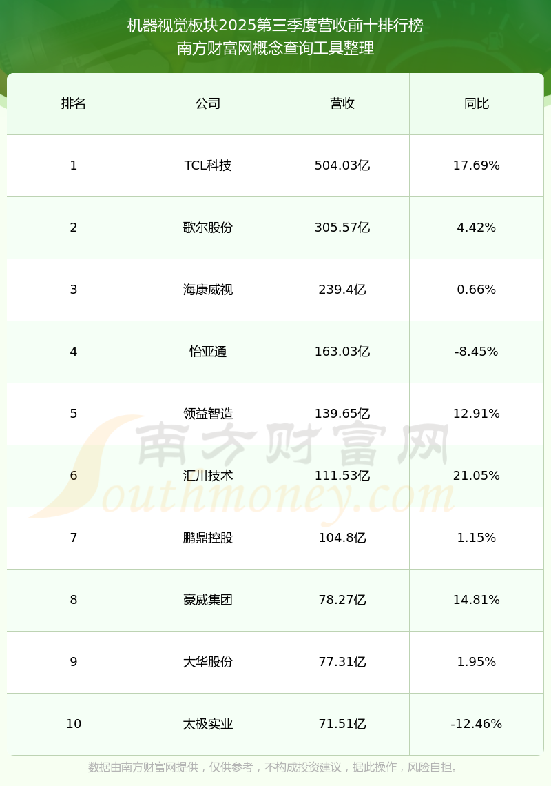 按照南方財富網概念查詢工具統(tǒng)計,該股所屬板塊為機器視覺板塊,該板塊共有175只股票,大恒科技2025第三季度營收在該板塊中排名為第71名,該板塊2025第三季度營收排名前十的股票如下表: