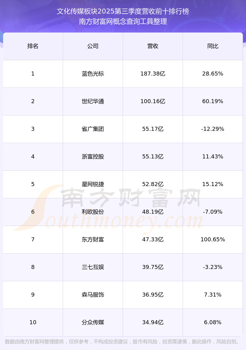 按照南方財富網(wǎng)概念查詢工具統(tǒng)計,該股所屬板塊為文化傳媒板塊,該板塊共有240只股票,浙文互聯(lián)2025第三季度營收在該板塊中排名為第32名,該板塊2025第三季度營收排名前十的股票如下表: