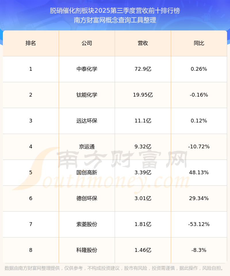 按照南方財富網(wǎng)概念查詢工具統(tǒng)計,該股所屬板塊為脫硝催化劑板塊,該板塊共有8只股票,元琛科技2025第三季度營收在該板塊中排名為第8名,該板塊2025第三季度營收排名前十的股票如下表:
