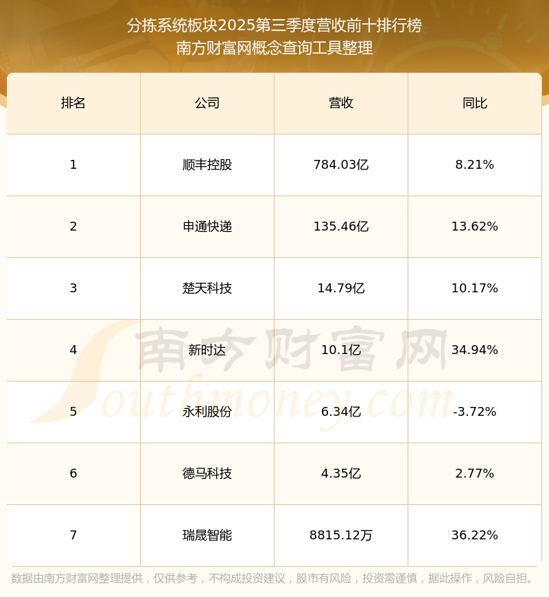 按照南方財富網(wǎng)概念查詢工具統(tǒng)計,該股所屬板塊為分揀系統(tǒng)板塊,該板塊共有7只股票,中科微至2025第三季度營收在該板塊中排名為第7名,該板塊2025第三季度營收排名前十的股票如下表: