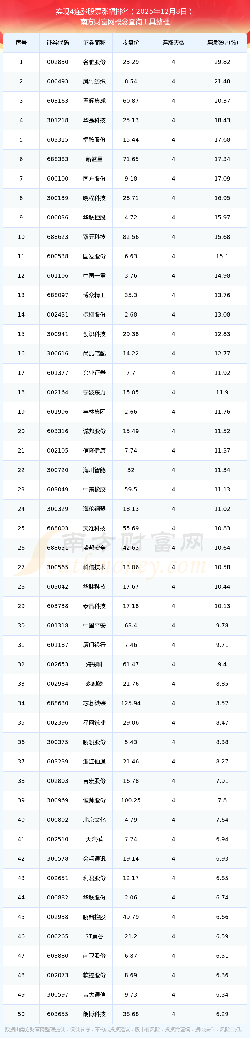 2025年12月8日實(shí)現(xiàn)4連漲股票漲幅排名
