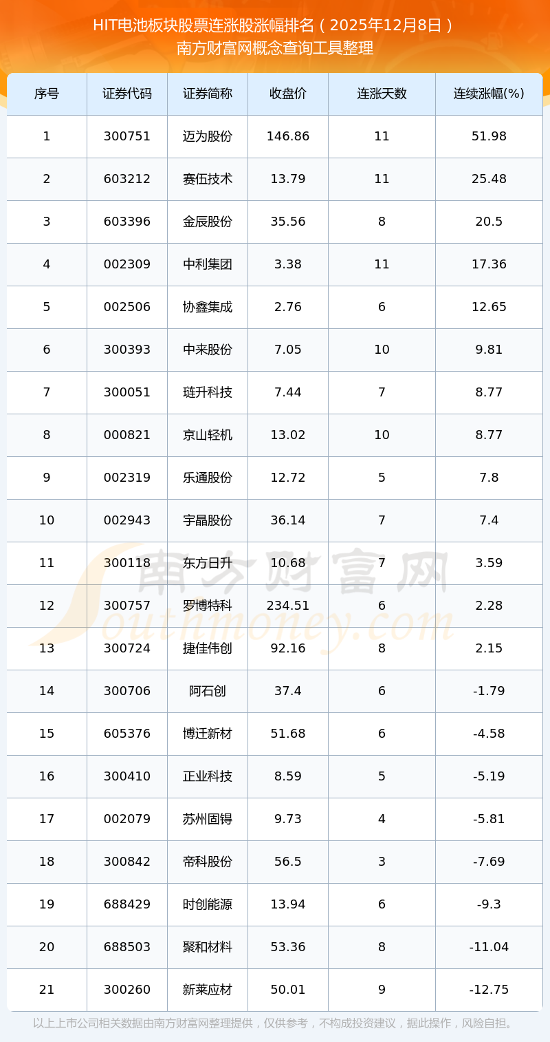 2025年12月8日HIT電池板塊股票連漲股漲幅排名
