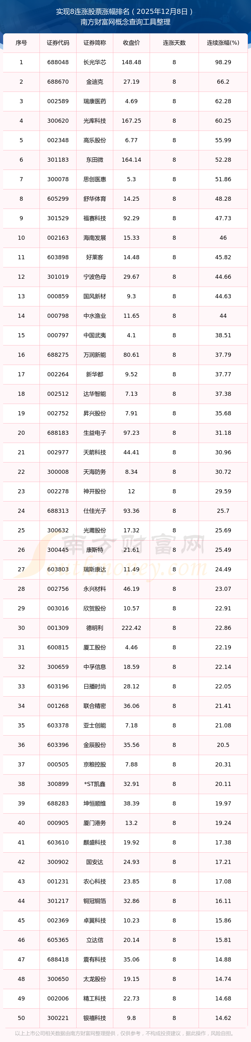 根據南方財富網概念查詢工具數據統計,截止2025年12月8日收盤,共有108只個股實現8天連漲。其中連續(xù)漲幅較大的個股有長光華芯、金迪克、瑞康醫(yī)藥等,連續(xù)漲幅分別為98.29%、66.20%、62.28%。