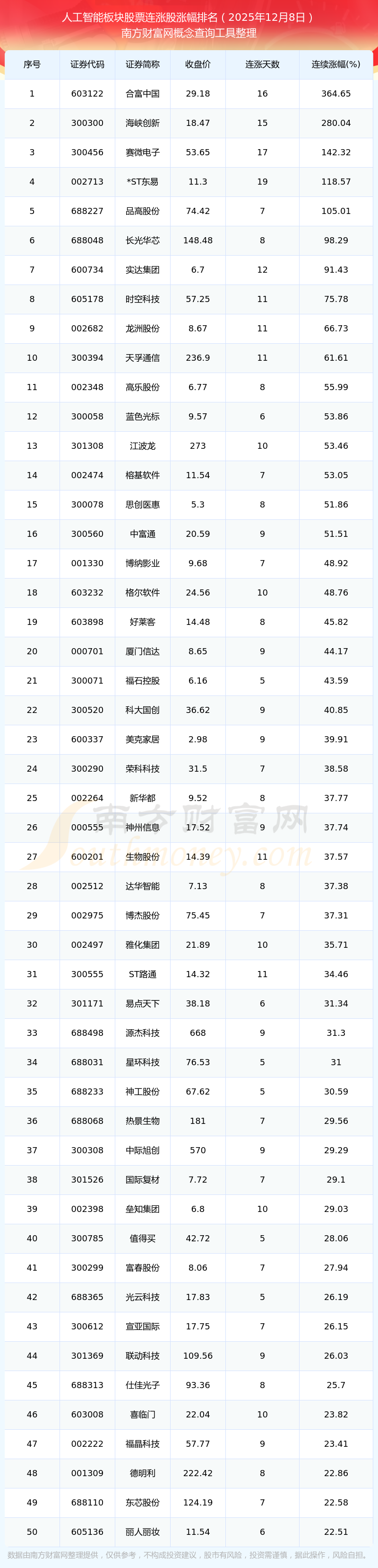 2025年12月8日人工智能板塊股票連漲股漲幅排名