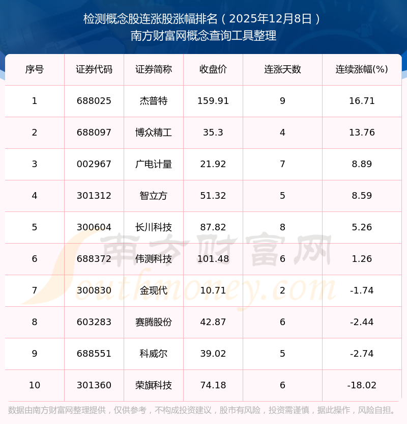 根據(jù)南方財(cái)富網(wǎng)概念查詢工具數(shù)據(jù)統(tǒng)計(jì),截止2025年12月8日收盤(pán),檢測(cè)概念股共有10只個(gè)股實(shí)現(xiàn)連漲。其中連續(xù)漲幅較大的個(gè)股有杰普特、博眾精工、廣電計(jì)量等,連續(xù)漲幅分別為16.71%、13.76%、8.89%。