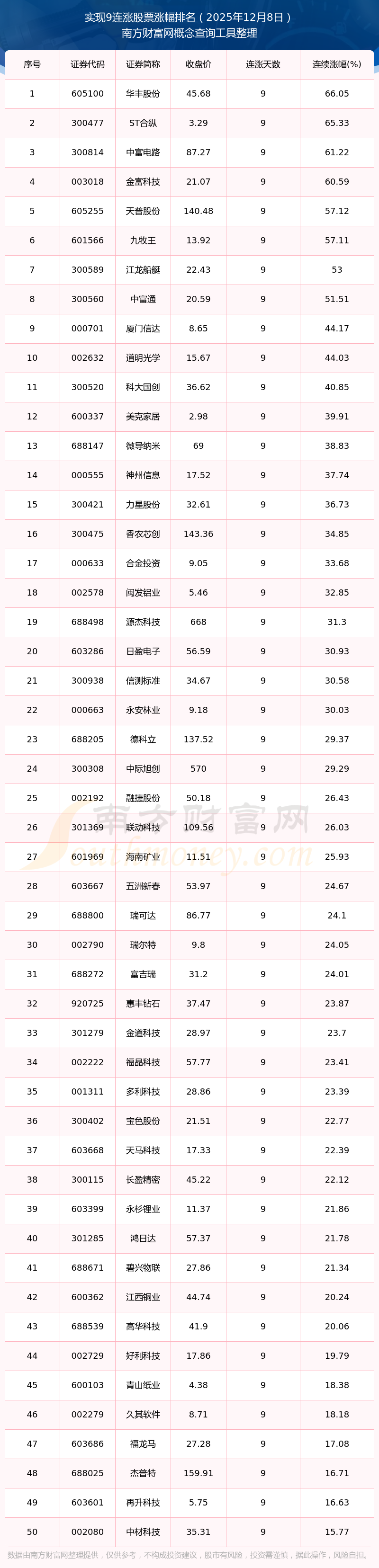 2025年12月8日實現(xiàn)9連漲股票漲幅排名