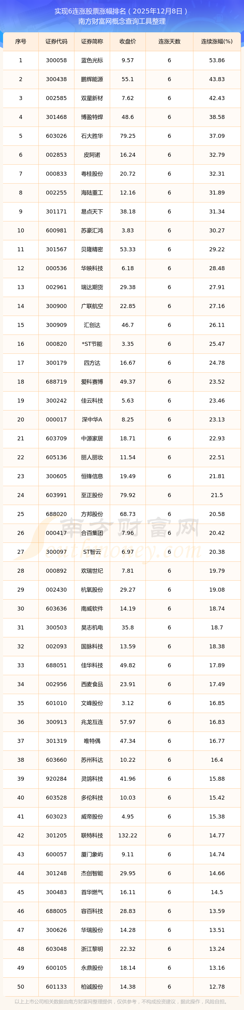 2025年12月8日實(shí)現(xiàn)6連漲股票漲幅排名