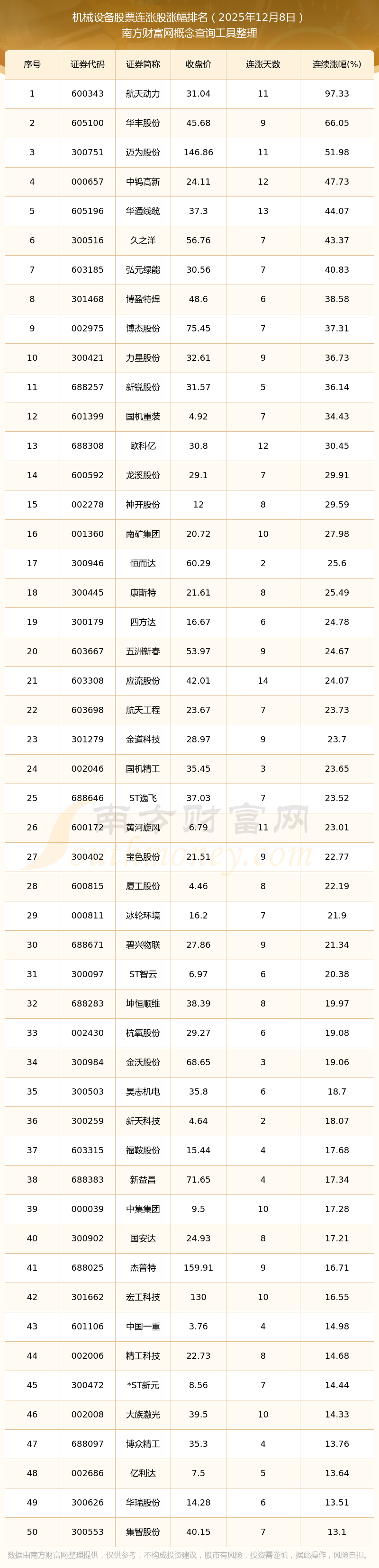 根據(jù)南方財(cái)富網(wǎng)概念查詢工具數(shù)據(jù)統(tǒng)計(jì),截止2025年12月8日收盤,機(jī)械設(shè)備股票共有172只個(gè)股實(shí)現(xiàn)連漲。其中連續(xù)漲幅較大的個(gè)股有航天動(dòng)力、華豐股份、邁為股份等,連續(xù)漲幅分別為97.33%、66.05%、51.98%。