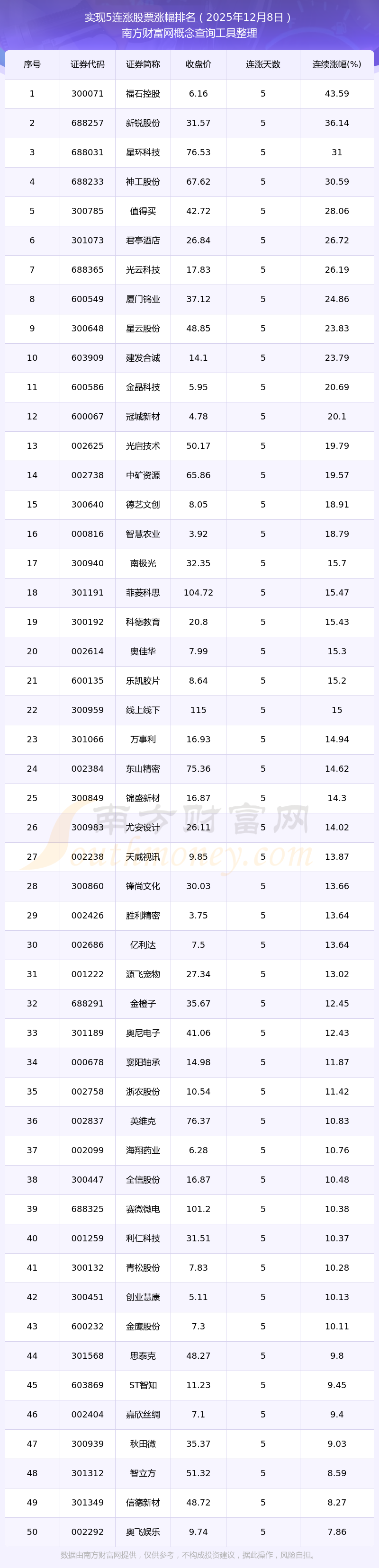 2025年12月8日實(shí)現(xiàn)5連漲股票漲幅排名