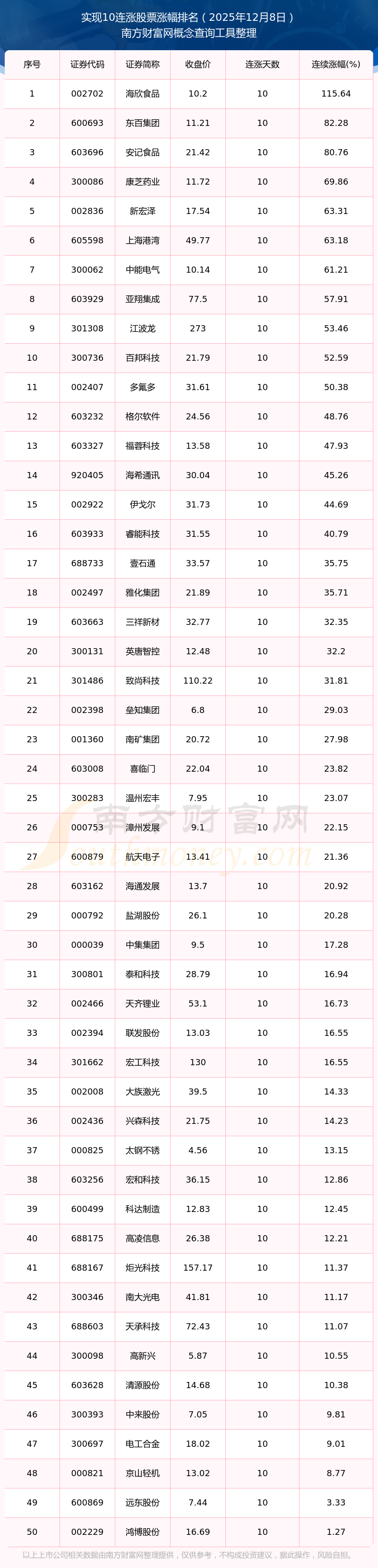 根據(jù)南方財富網(wǎng)概念查詢工具數(shù)據(jù)統(tǒng)計,截止2025年12月8日收盤,共有52只個股實現(xiàn)10天連漲。其中連續(xù)漲幅較大的個股有海欣食品、東百集團、安記食品等,連續(xù)漲幅分別為115.64%、82.28%、80.76%。