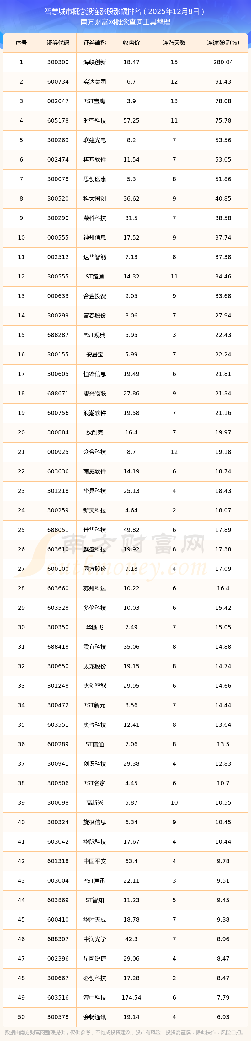 2025年12月8日智慧城市概念股連漲股漲幅排名