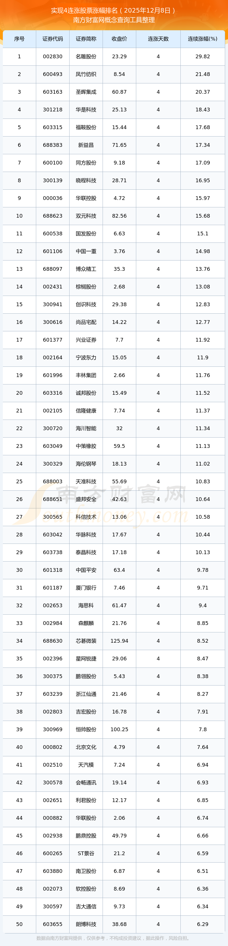根據(jù)南方財(cái)富網(wǎng)概念查詢工具數(shù)據(jù)統(tǒng)計(jì),截止2025年12月8日收盤,共有164只個(gè)股實(shí)現(xiàn)4天連漲。其中連續(xù)漲幅較大的個(gè)股有名雕股份、鳳竹紡織、圣暉集成等,連續(xù)漲幅分別為29.82%、21.48%、20.37%。