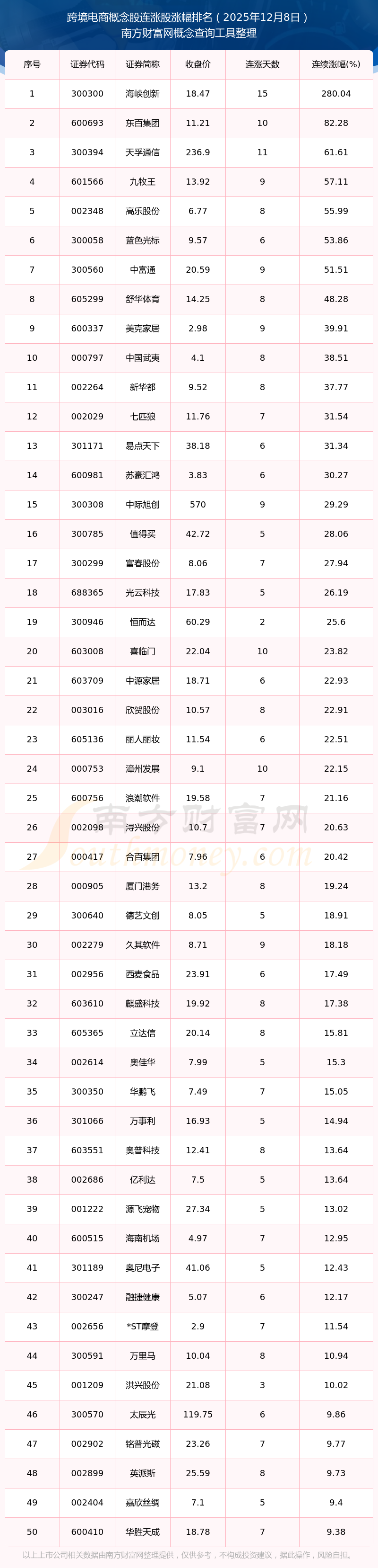 根據(jù)南方財(cái)富網(wǎng)概念查詢工具數(shù)據(jù)統(tǒng)計(jì),截止2025年12月8日收盤(pán),跨境電商概念股共有101只個(gè)股實(shí)現(xiàn)連漲。其中連續(xù)漲幅較大的個(gè)股有海峽創(chuàng)新、東百集團(tuán)、天孚通信等,連續(xù)漲幅分別為280.04%、82.28%、61.61%。