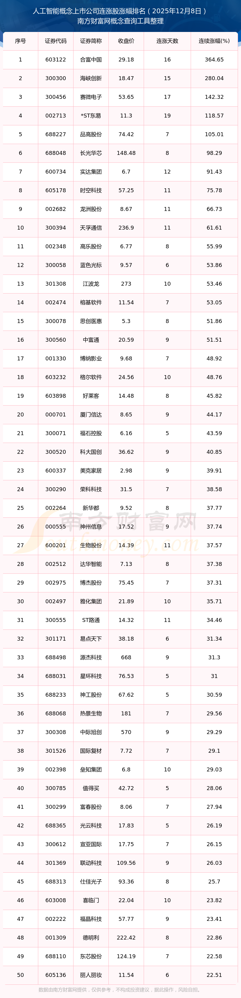 2025年12月8日人工智能概念上市公司連漲股漲幅排名