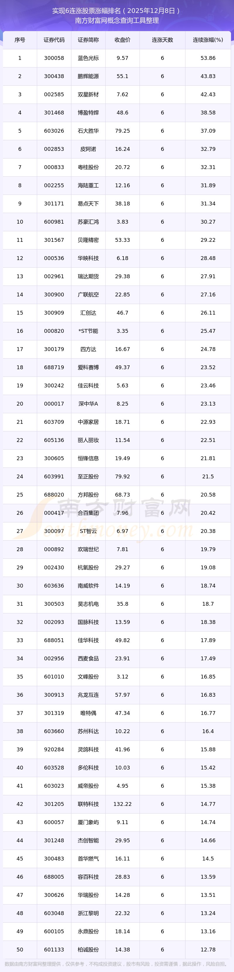 2025年12月8日實(shí)現(xiàn)6連漲股票漲幅排名