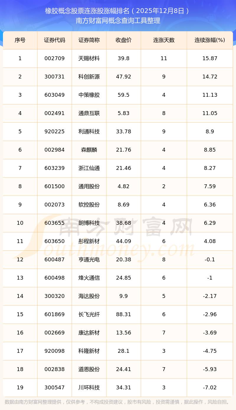 2025年12月8日橡膠概念股票連漲股漲幅排名