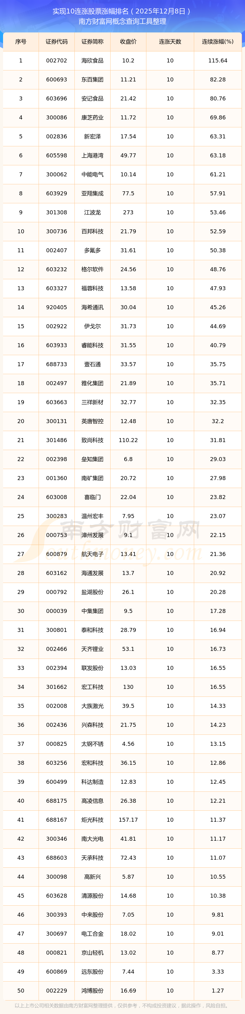 根據(jù)南方財(cái)富網(wǎng)概念查詢工具數(shù)據(jù)統(tǒng)計(jì),截止2025年12月8日收盤,共有52只個(gè)股實(shí)現(xiàn)10天連漲。其中連續(xù)漲幅較大的個(gè)股有海欣食品、東百集團(tuán)、安記食品等,連續(xù)漲幅分別為115.64%、82.28%、80.76%。