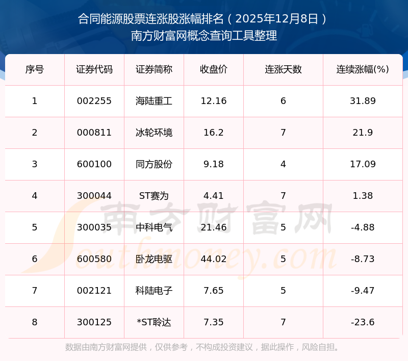 2025年12月8日合同能源股票連漲股票漲幅排名