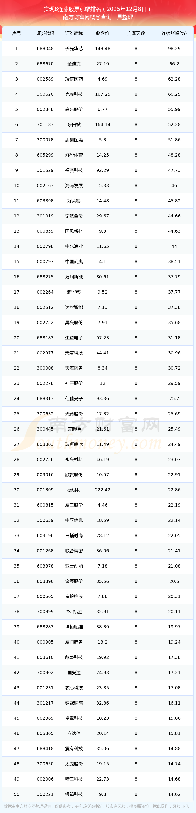 2025年12月8日實現(xiàn)8連漲股票漲幅排名