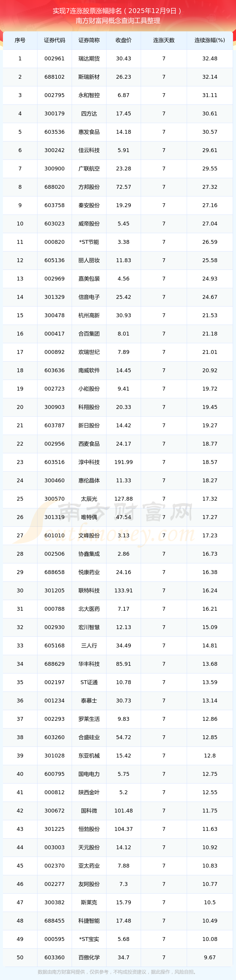 2025年12月9日實(shí)現(xiàn)7連漲股票漲幅排名
