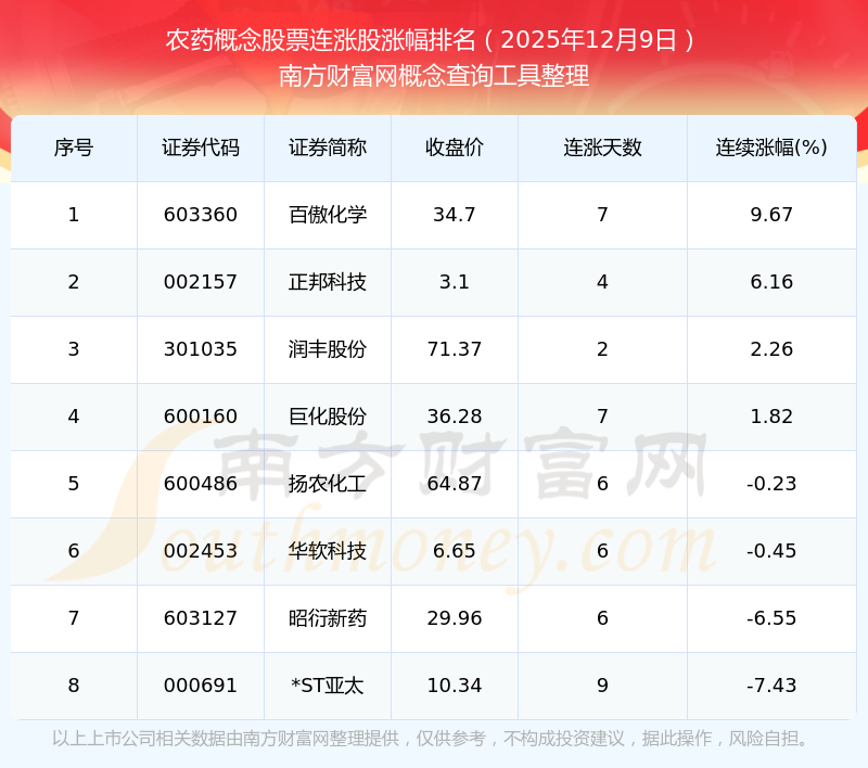 2025年12月9日農(nóng)藥概念股票連漲股漲幅排名