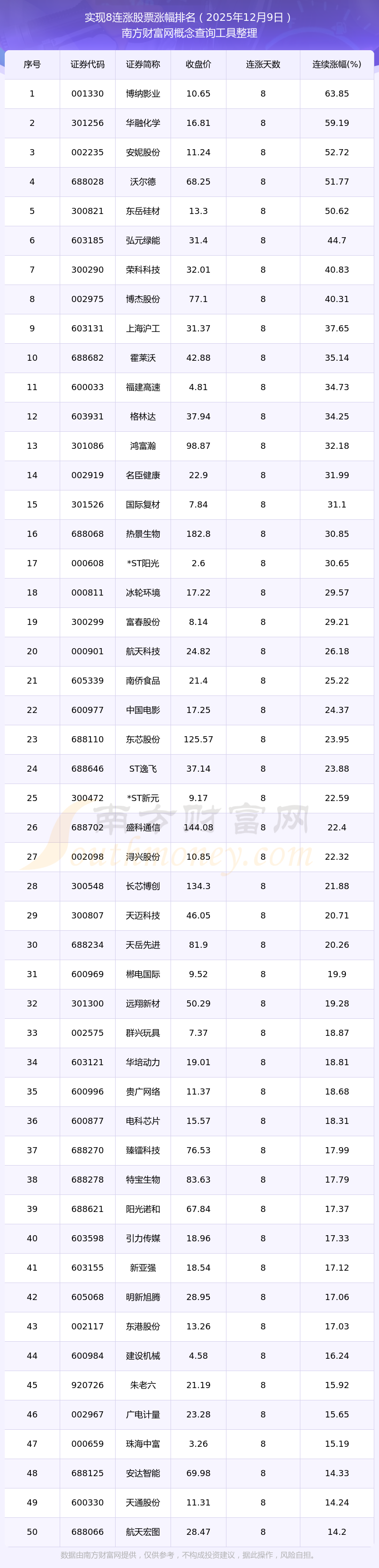 根據南方財富網概念查詢工具數據統(tǒng)計,截止2025年12月9日收盤,共有103只個股實現8天連漲。其中連續(xù)漲幅較大的個股有博納影業(yè)、華融化學、安妮股份等,連續(xù)漲幅分別為63.85%、59.19%、52.72%。