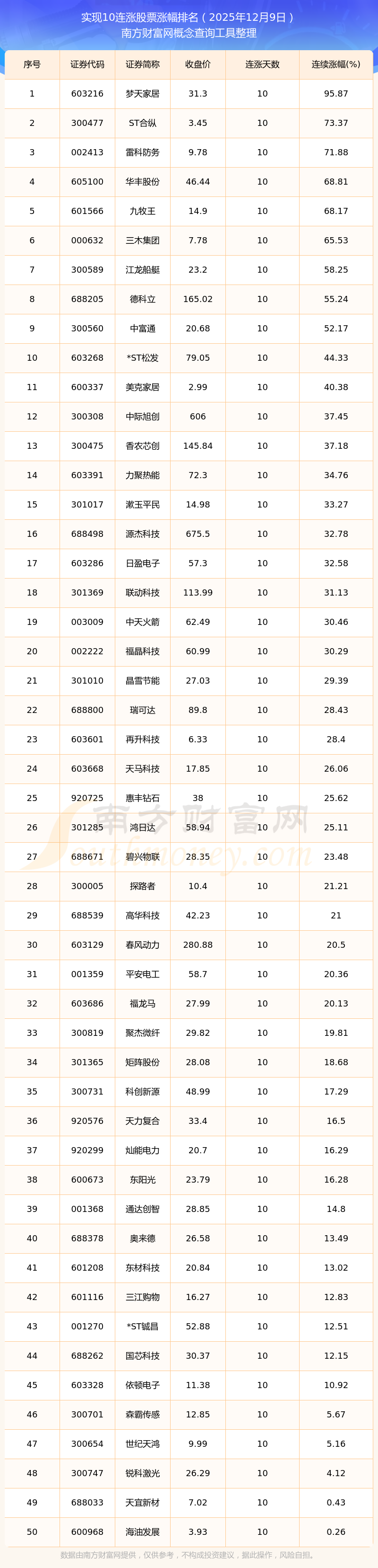 根據(jù)南方財富網(wǎng)概念查詢工具數(shù)據(jù)統(tǒng)計,截止2025年12月9日收盤,共有51只個股實現(xiàn)10天連漲。其中連續(xù)漲幅較大的個股有夢天家居、ST合縱、雷科防務等,連續(xù)漲幅分別為95.87%、73.37%、71.88%。